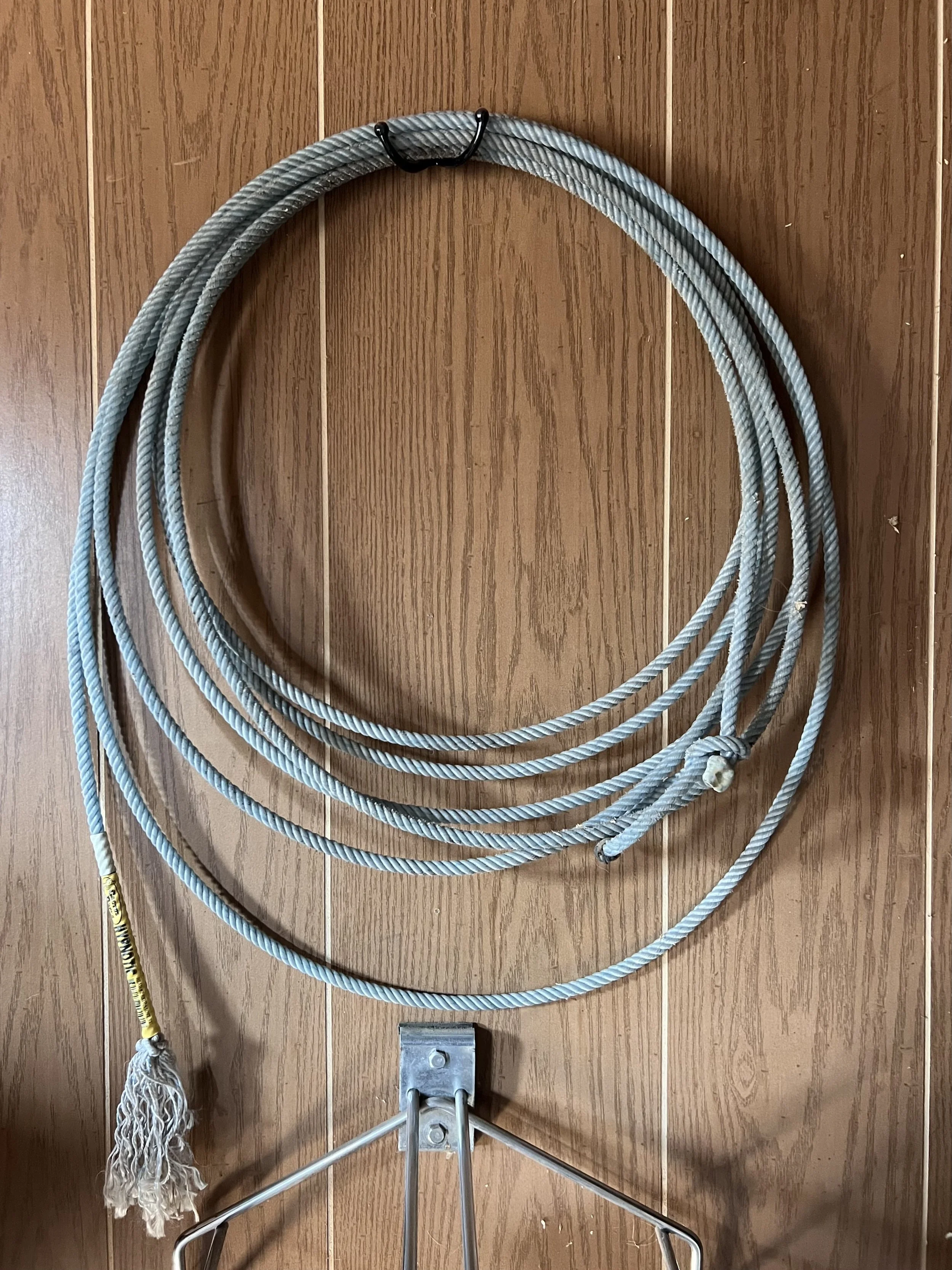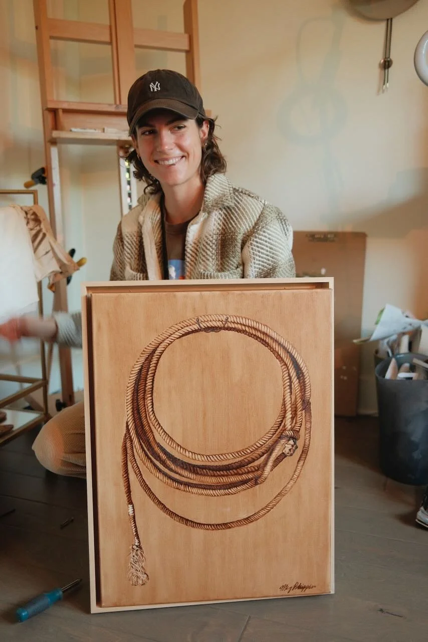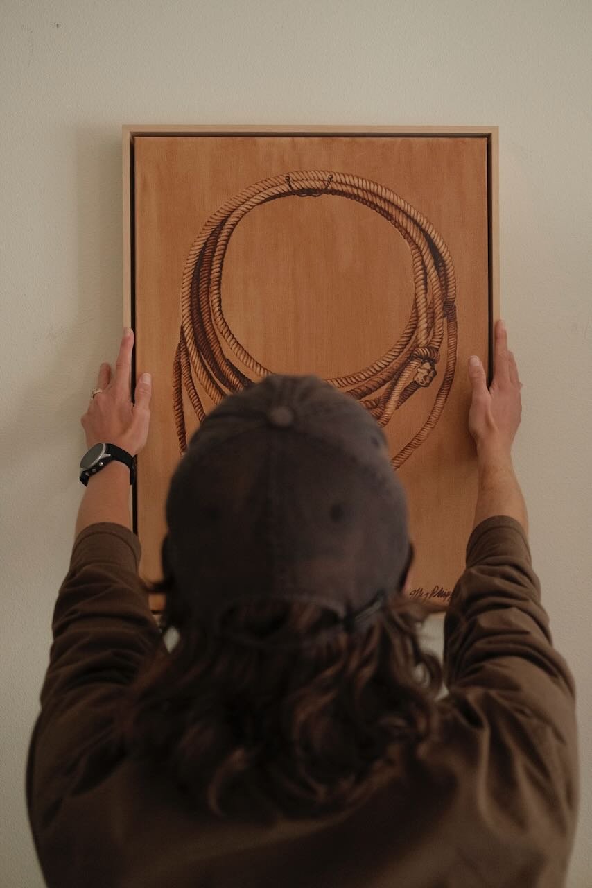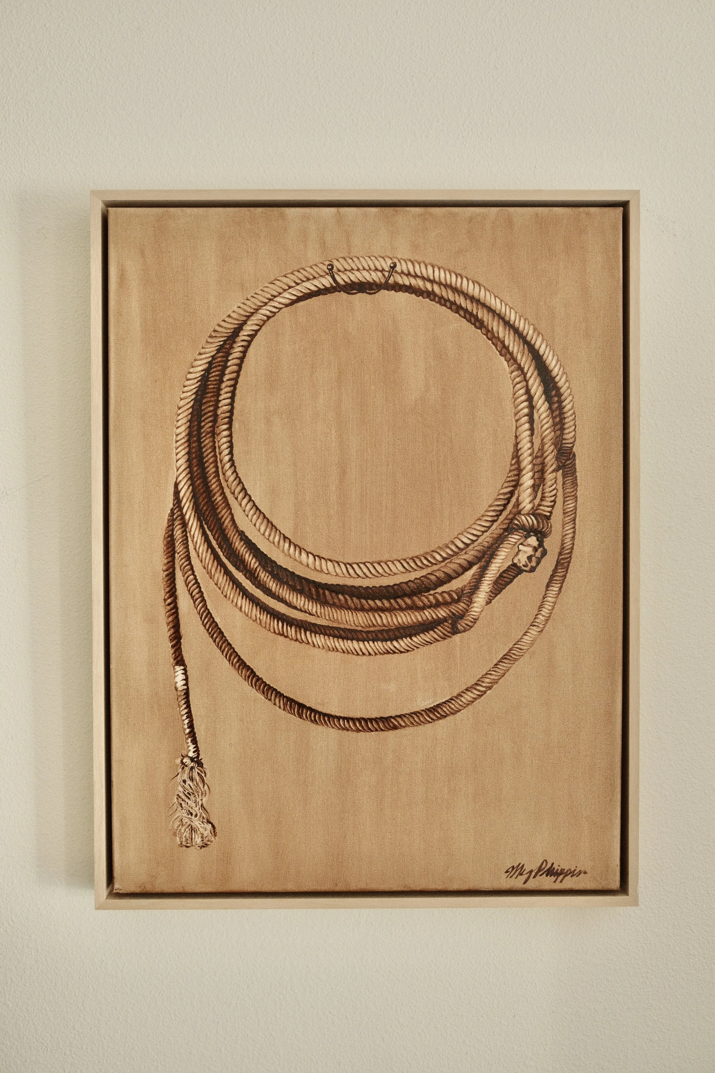 I got the inspiration for this painting while grabbing some gear out of my sister and brother in law’s saddle house up in Montana. They have this exact lasso hanging up on the wall, waiting for their next ride. I took a photo of it, knowing I’d want to one day use it as a reference for a painting.