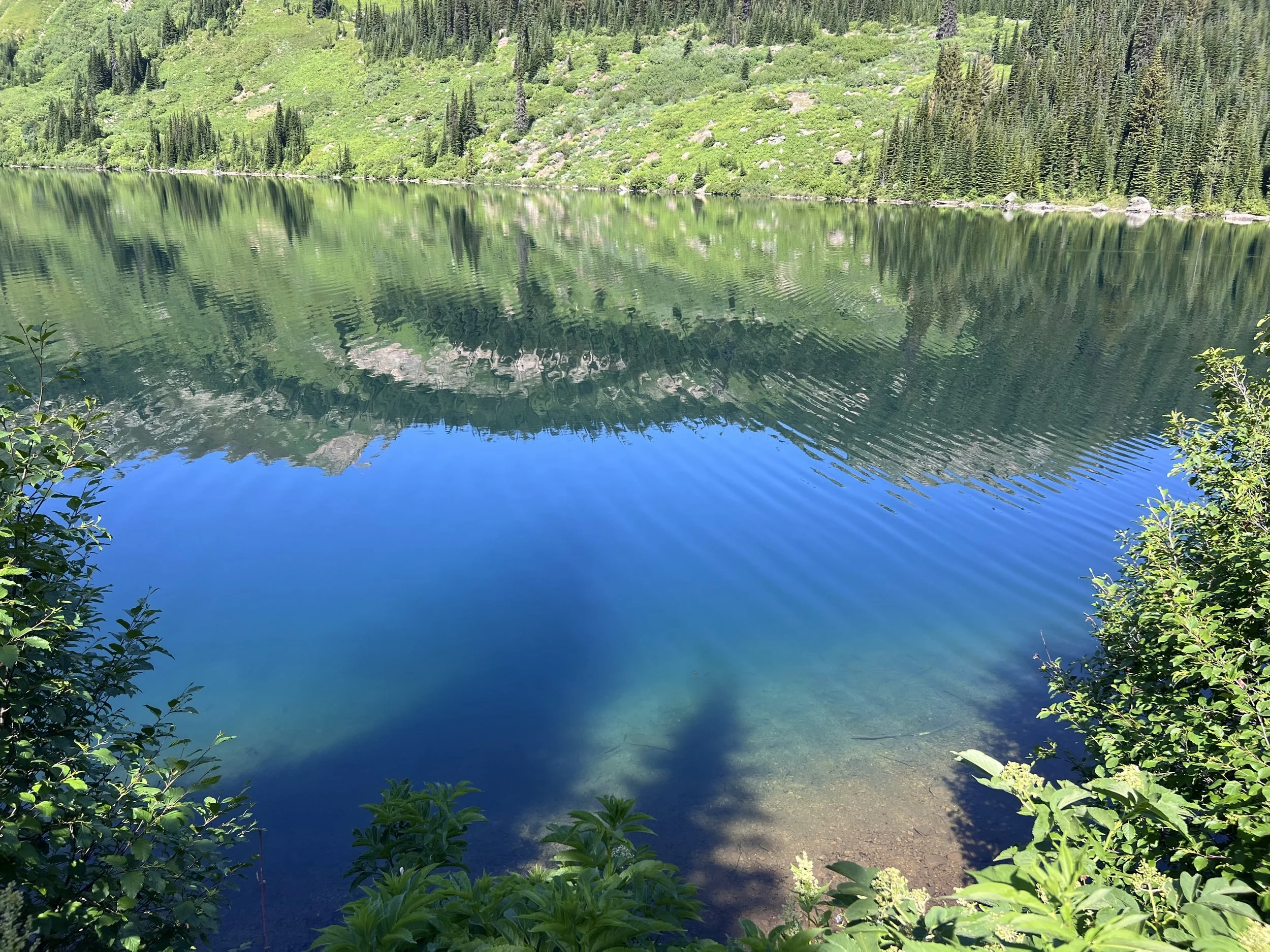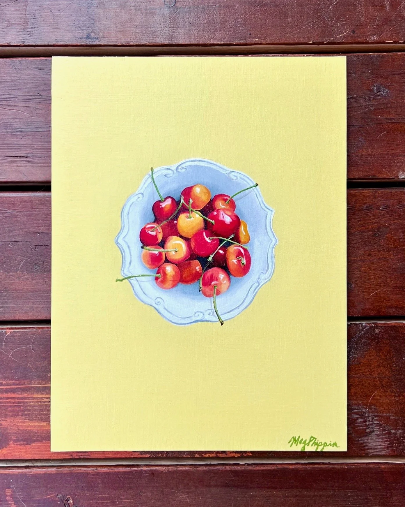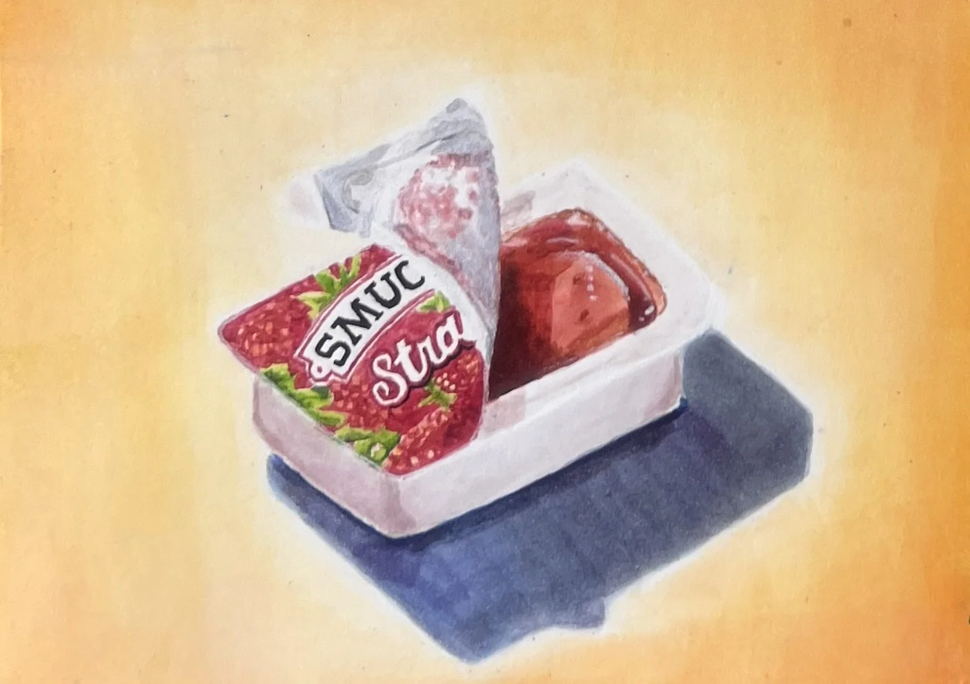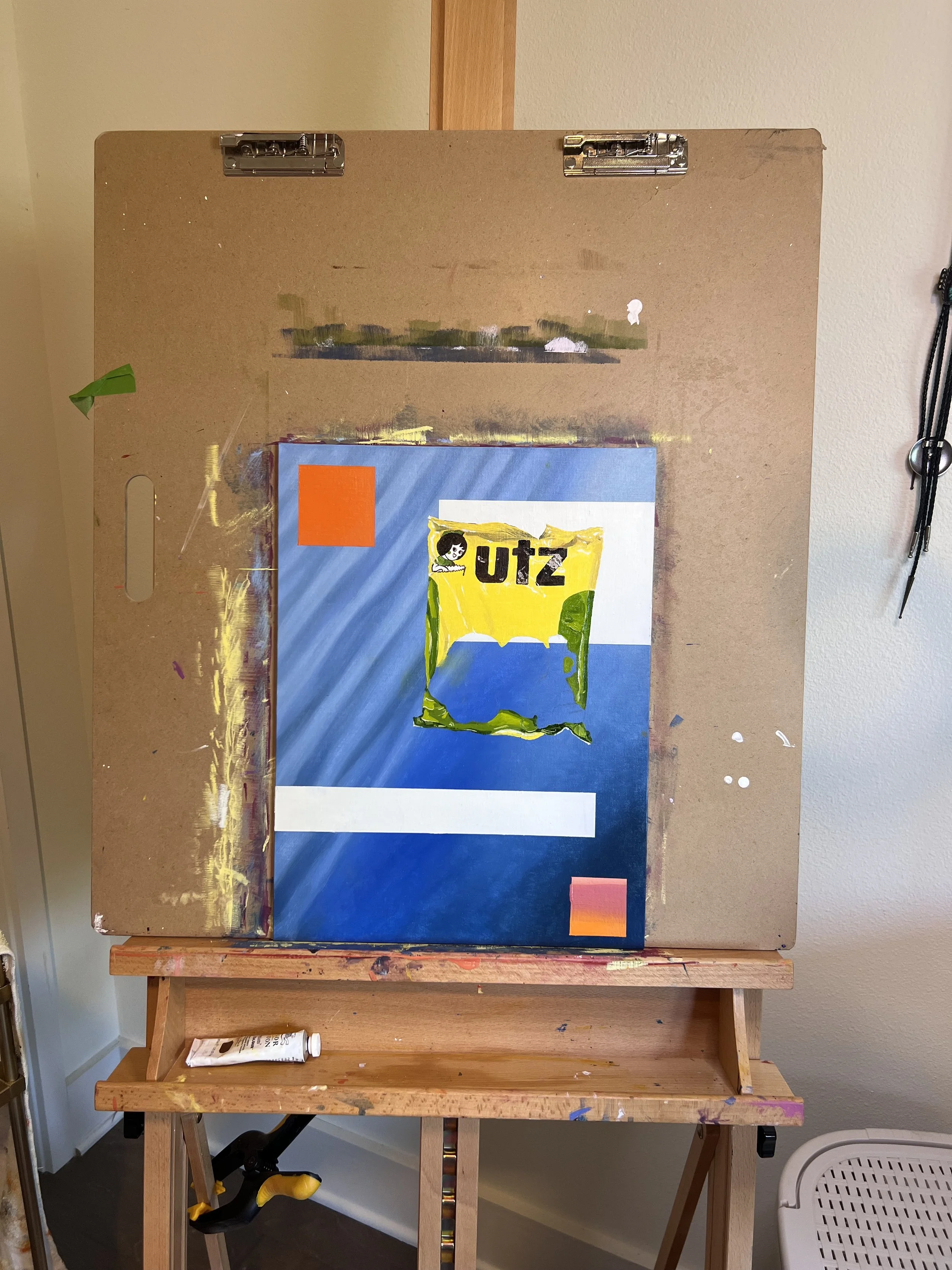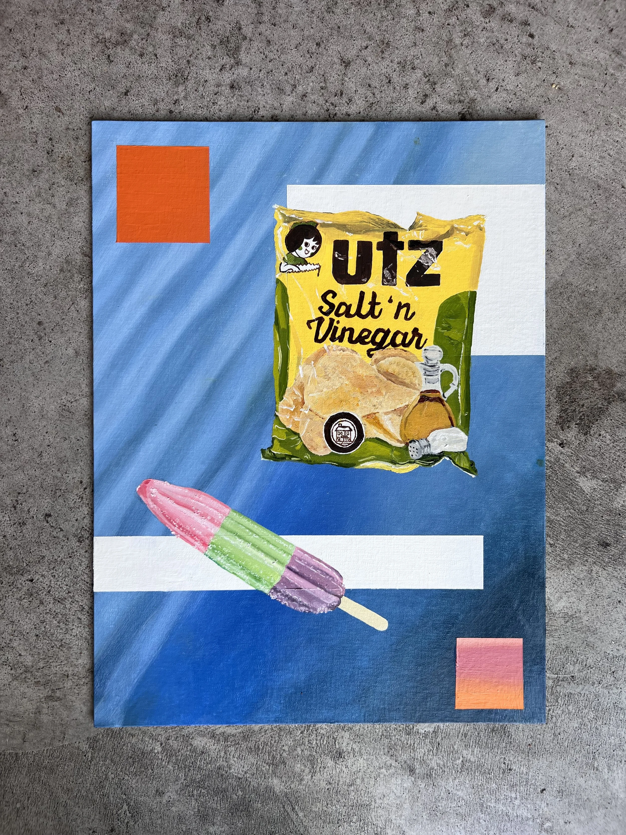 The painting is built in three collage-inspired layers. The rippling blue background is a closeup of a lake I hiked to this summer. The blocks of color capture the feeling of summer heat. And the photo-realistic snacks are supposed to feel ready to eat.